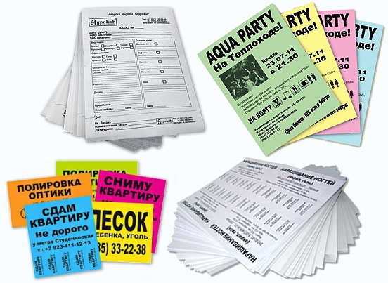 Оперативная печать листовок, объявлений, бланков. Цвет чернил: черный, красный, синий. Цвет бумаги: на выбор, вариантов много.